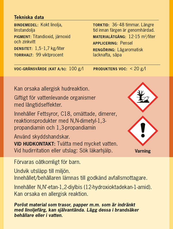 OBS! Vit Invändig linoljefärg bör pigmenteras något (t.ex. S 0500-N) då ytor där ljus inte kommer till annars kommer att gulna.