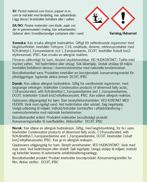 Engwall o. Claesson utvändig linoljefärg är baserad på svensk rå, kallpressad linolja och linstandolja. Den innehåller mögelskydd och är avsedd för målning av träfasader, fönsterkarmar, foder, snickerier mm.
